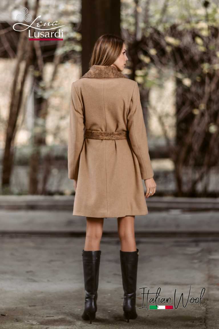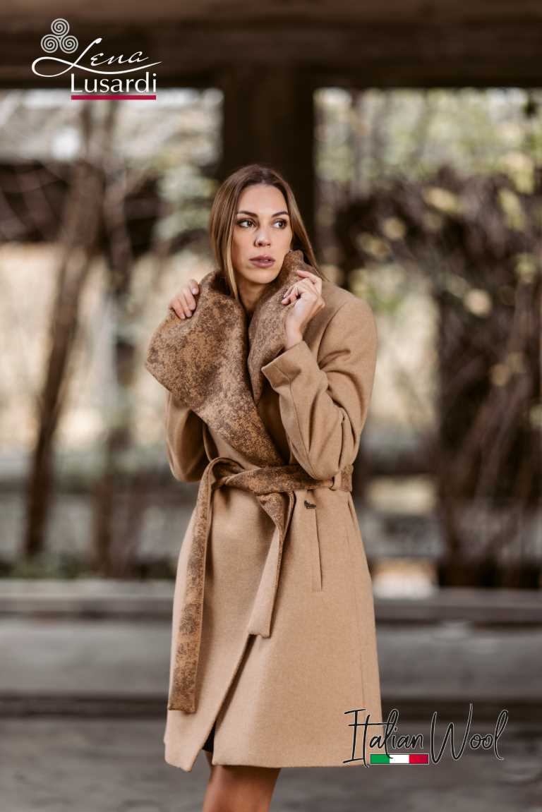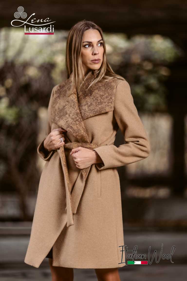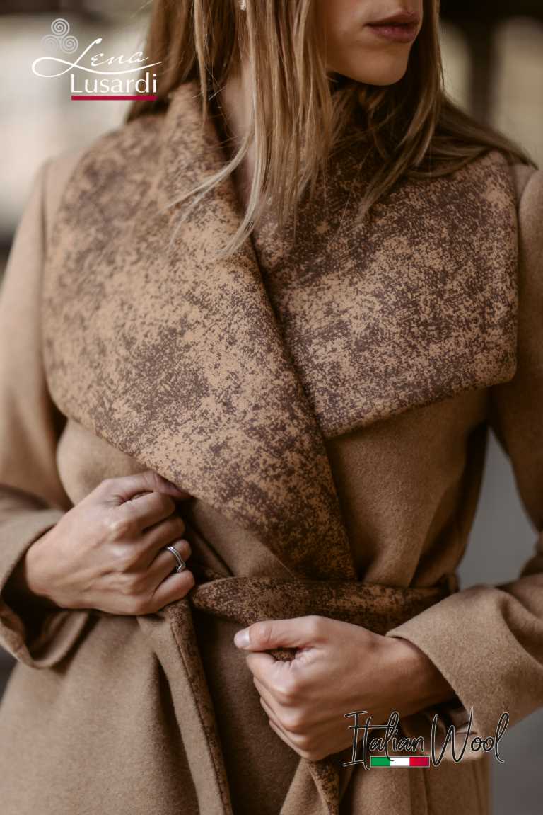 Elegantni kaput od visokokvalitetne italijanske vune, sa raskošnim širokim reverima i pojasom koji naglašava liniju tela. Moderno krojen, udoban i ženstven, idealan za dame koje vole spoj luksuza, topline i prefinjenog dizajna. Savršen za sve prilike — od dnevnih do večernjih.